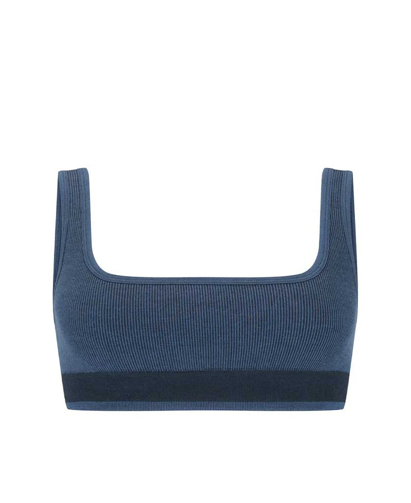 Superfine Merino wool seamless knit scoop-neck bralet in our premium rib fabrication. Offers mid compression and lined with a self knit layer for support. This style features a contrast hem band with a minimal jacquard logo at the back. Designed with highly breathable natural fibres for a super-soft second-skin feel against the body.