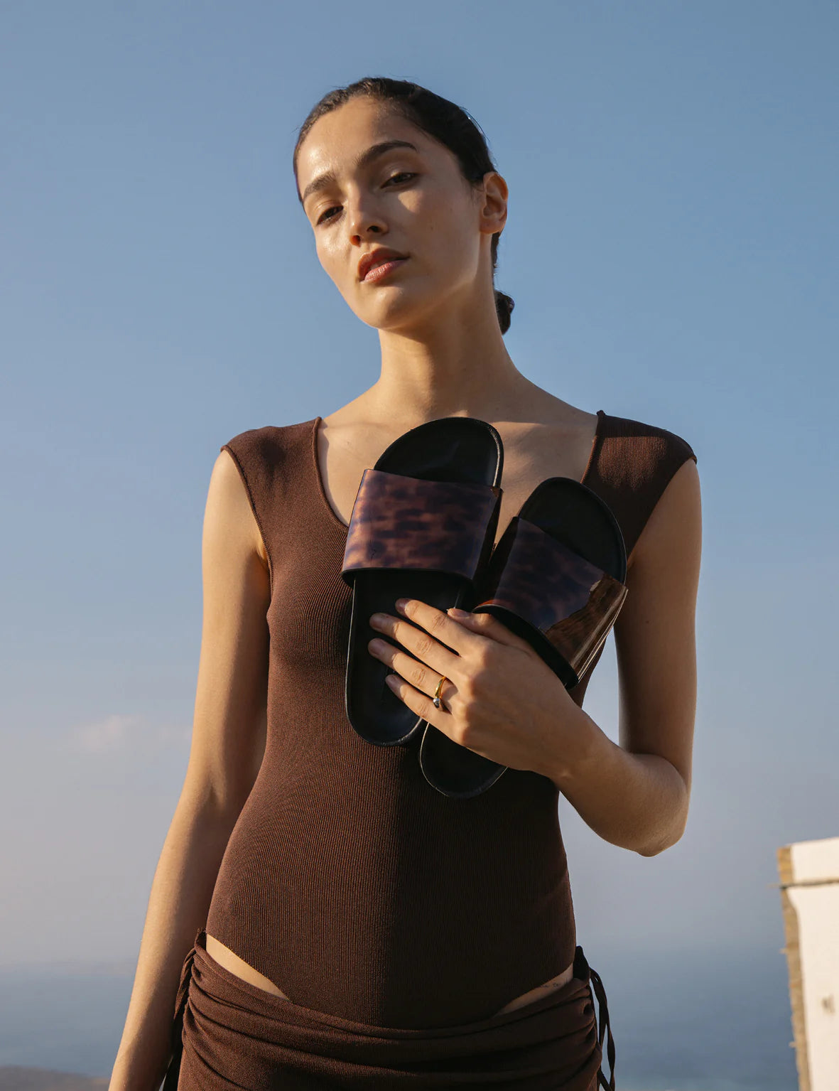A sculptural platform slide, grounded in ease and defined by an artful animal-print strap. Features a wrapped leather platform and printed leather strap.