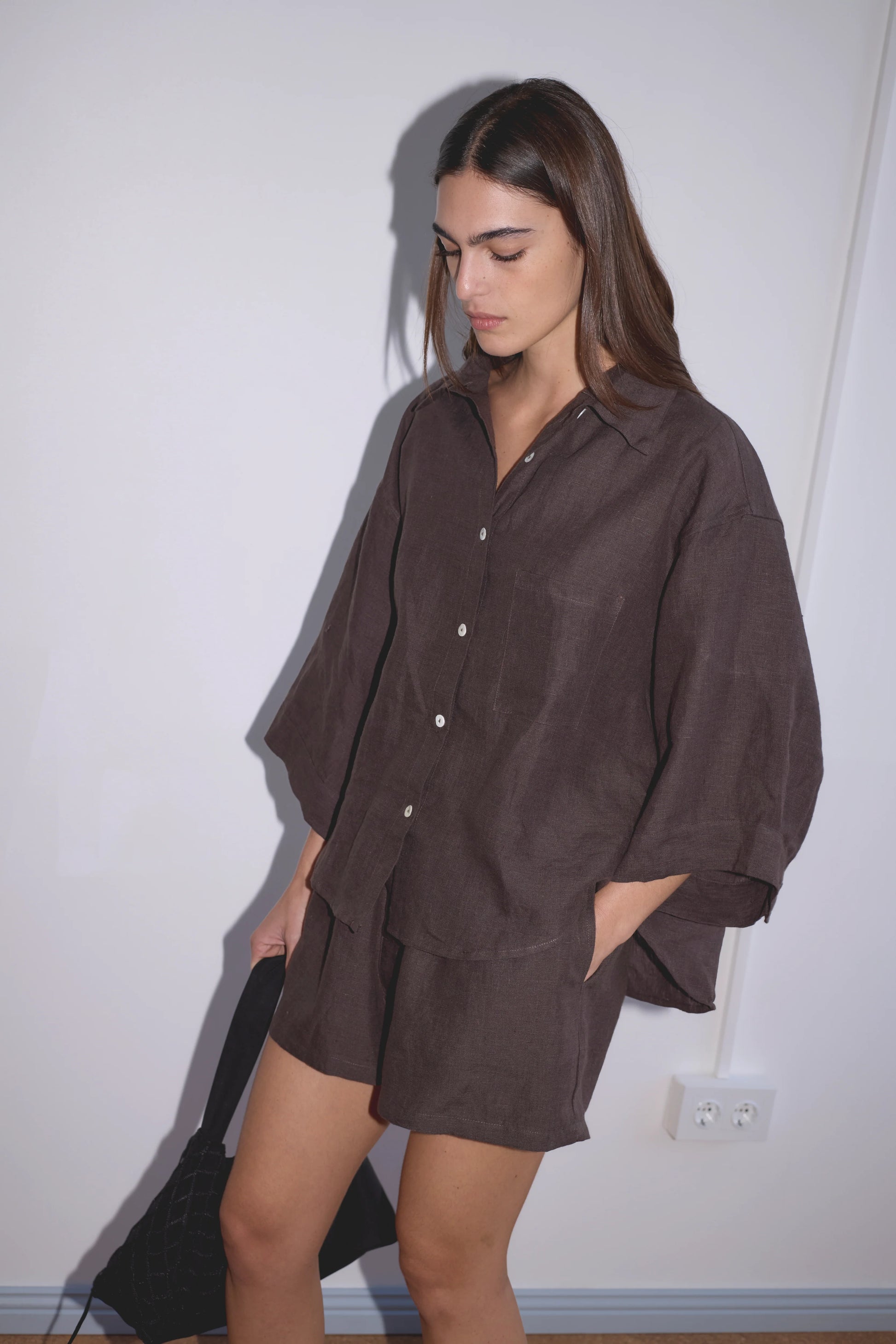features an oversized box fit linen shirt with wide arms and a front pocket designed to sit mid rise, the loose fitting boxer style shorts have a faux button down fly and an elastic waist for extra comfort