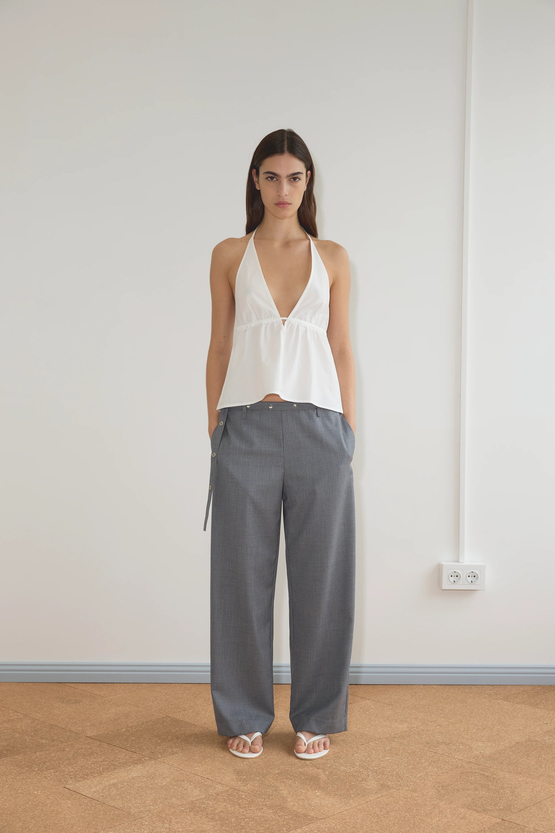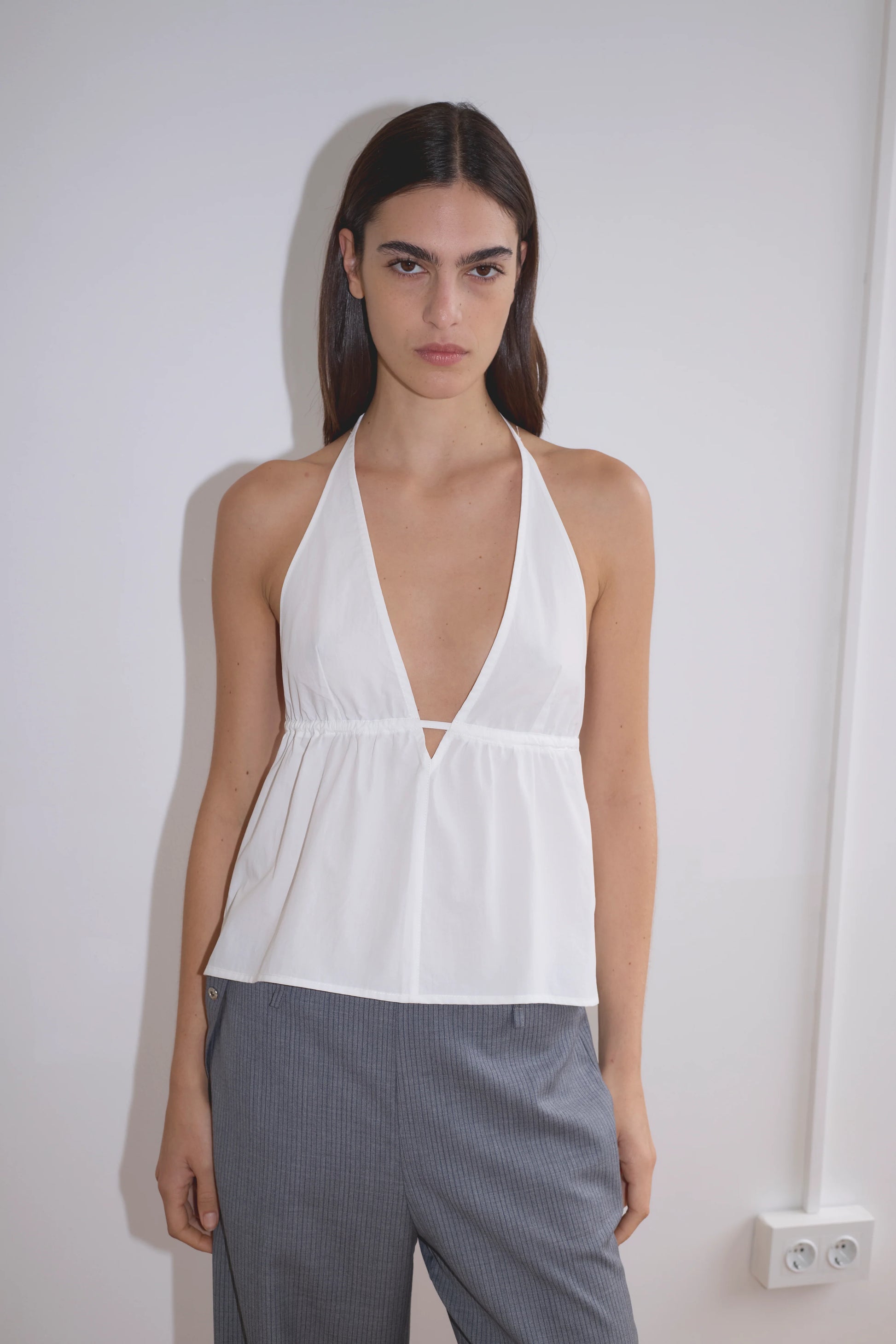 relaxed halter top features flattering v neckline, exposed drawcord front, adjustable backline with drawcord tie closure and silver button detail on split back