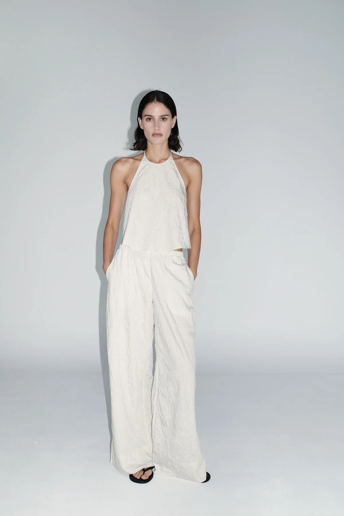 The Crushed Halter Top is defined by its minimalist silhouette and Japanese-inspired simplicity. Featuring a halter neckline with self-tie fastening, with an additional tie at the back waist. Pair with the Relaxed Crushed Pant for an effortlessly coordinated look.