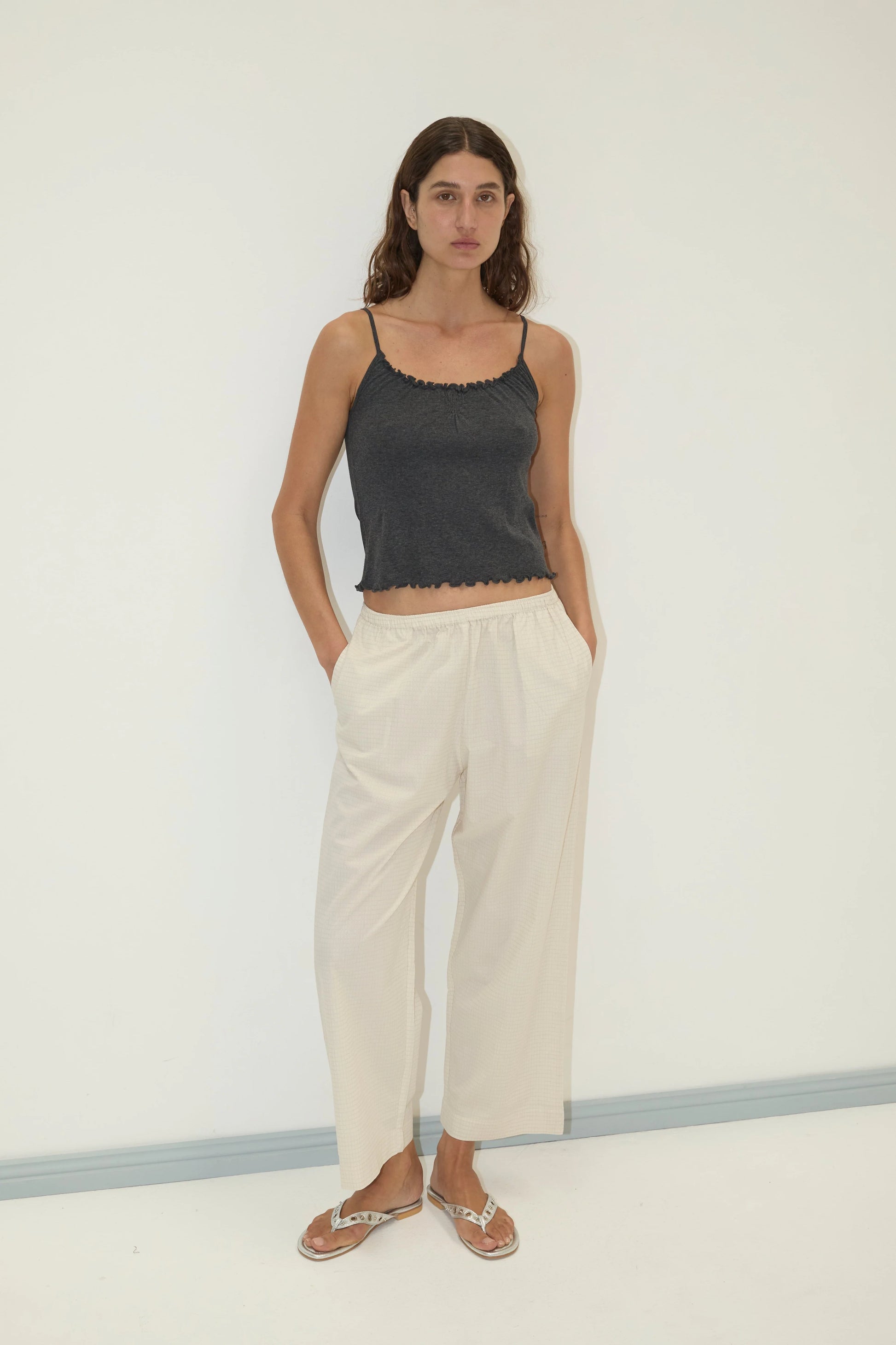 a soft fitted tank with elastic frill neckline, shirring v panel at centre front, fine self fabric straps and baby lock hem finish