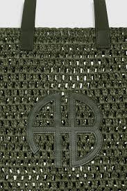 An essential woven tote bag crafted from a woven olive green seagrass material with tonal leather details.