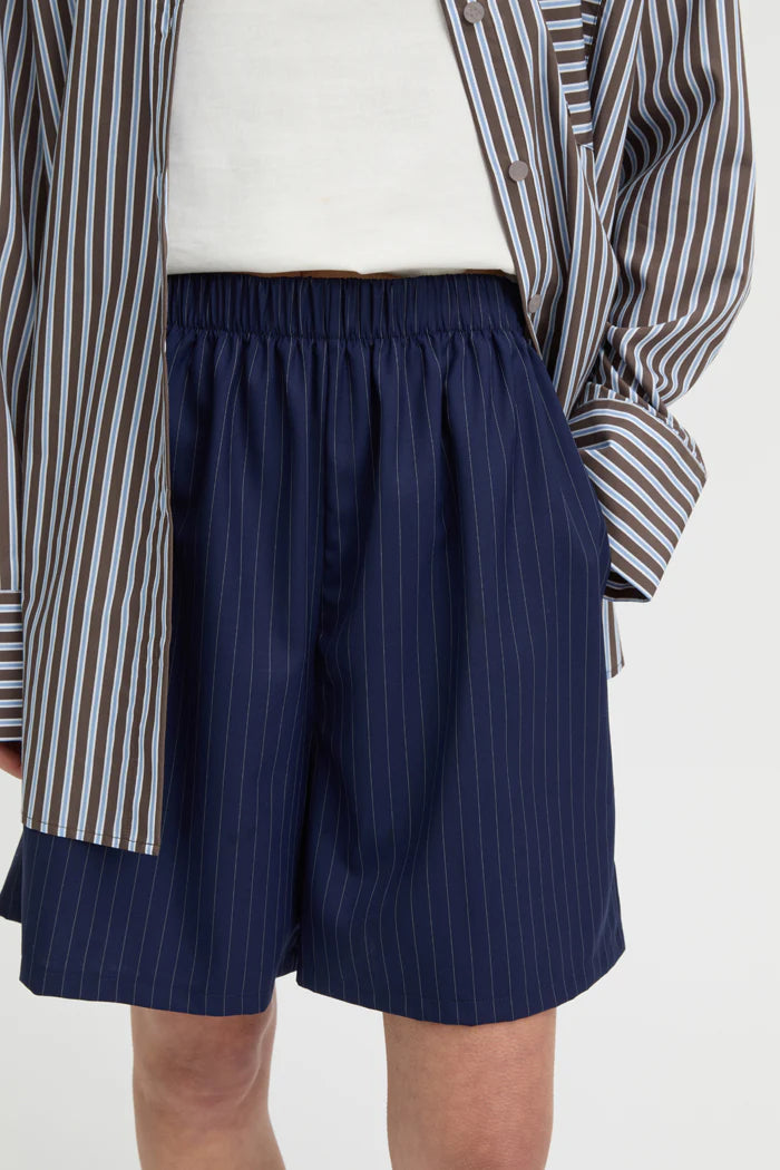 The Lazara Shorts in Navy offer a relaxed fit that blends comfort with style. Designed with a subtle pinstripe pattern, these shorts have a tailored feel while remaining casual enough for everyday wear. The elastic waistband ensures a comfortable fit, making them versatile for both lounging or dressing up with the right top and accessories. Pair it with the matching Lazara Blazer for a tailored look.